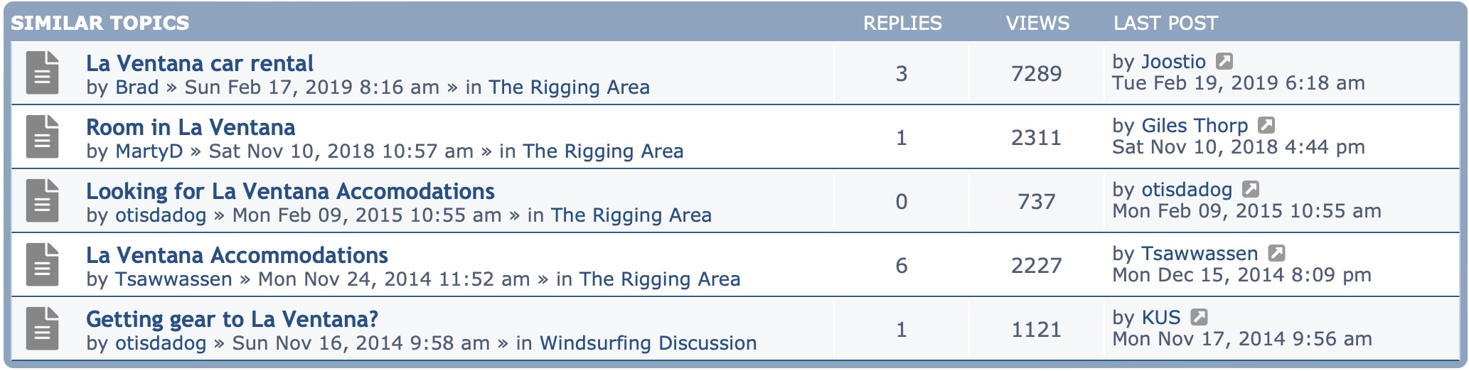 I then tried La Ventana Accommodations site:bigwavedave.ca and "La Ventana" site:bigwavedave.ca/forums on google, but no dice. For some reason neither forum, nor google search, landed on those similar topics but somehow the forum picked up on them after I posted. Not sure if there are more similar posts out there, apologies if I'm rehashing old news, although the ones I see are some 9 years old. Thanks.
