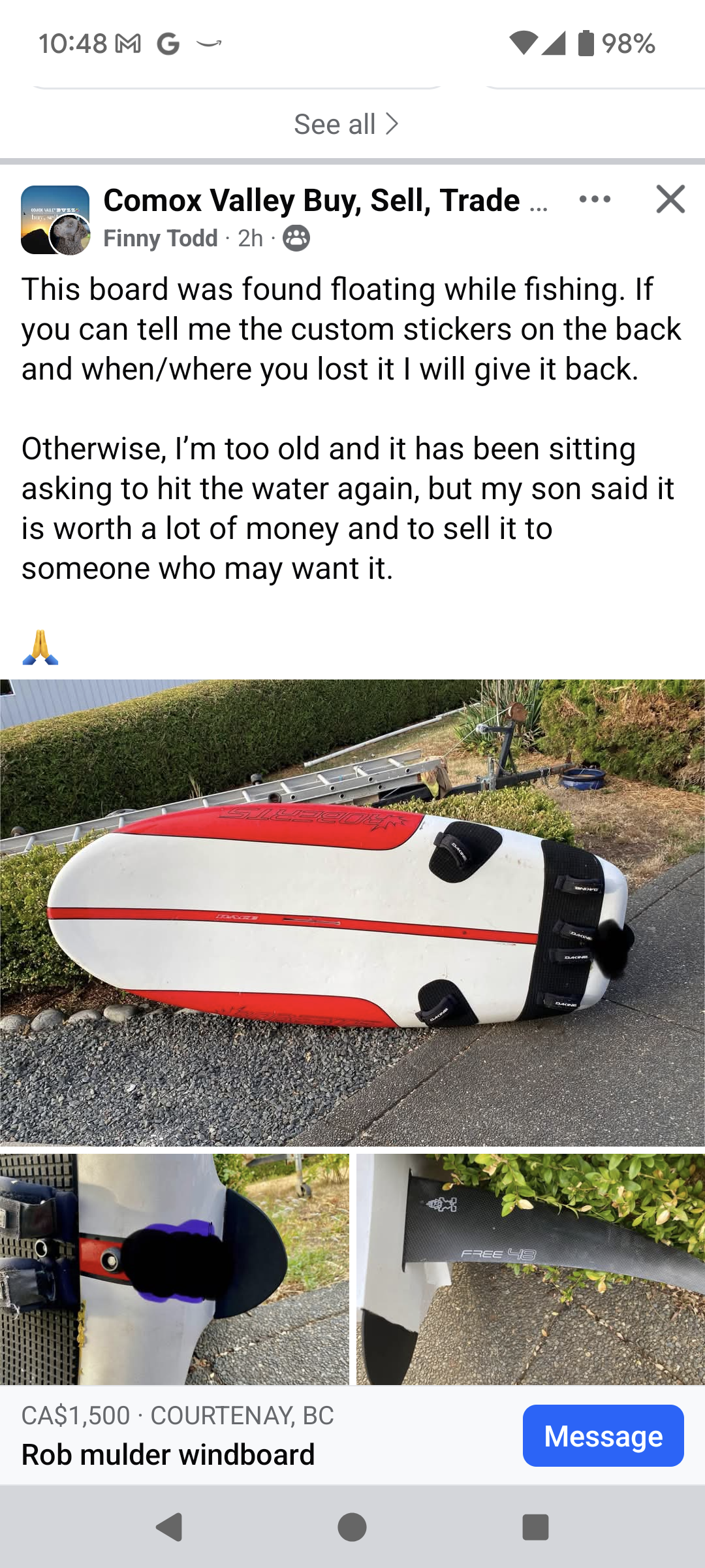 If you lost a Roberts board somewhere in the water, it is posted on Facebook in the Comox valley by and sell page